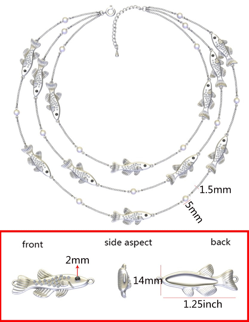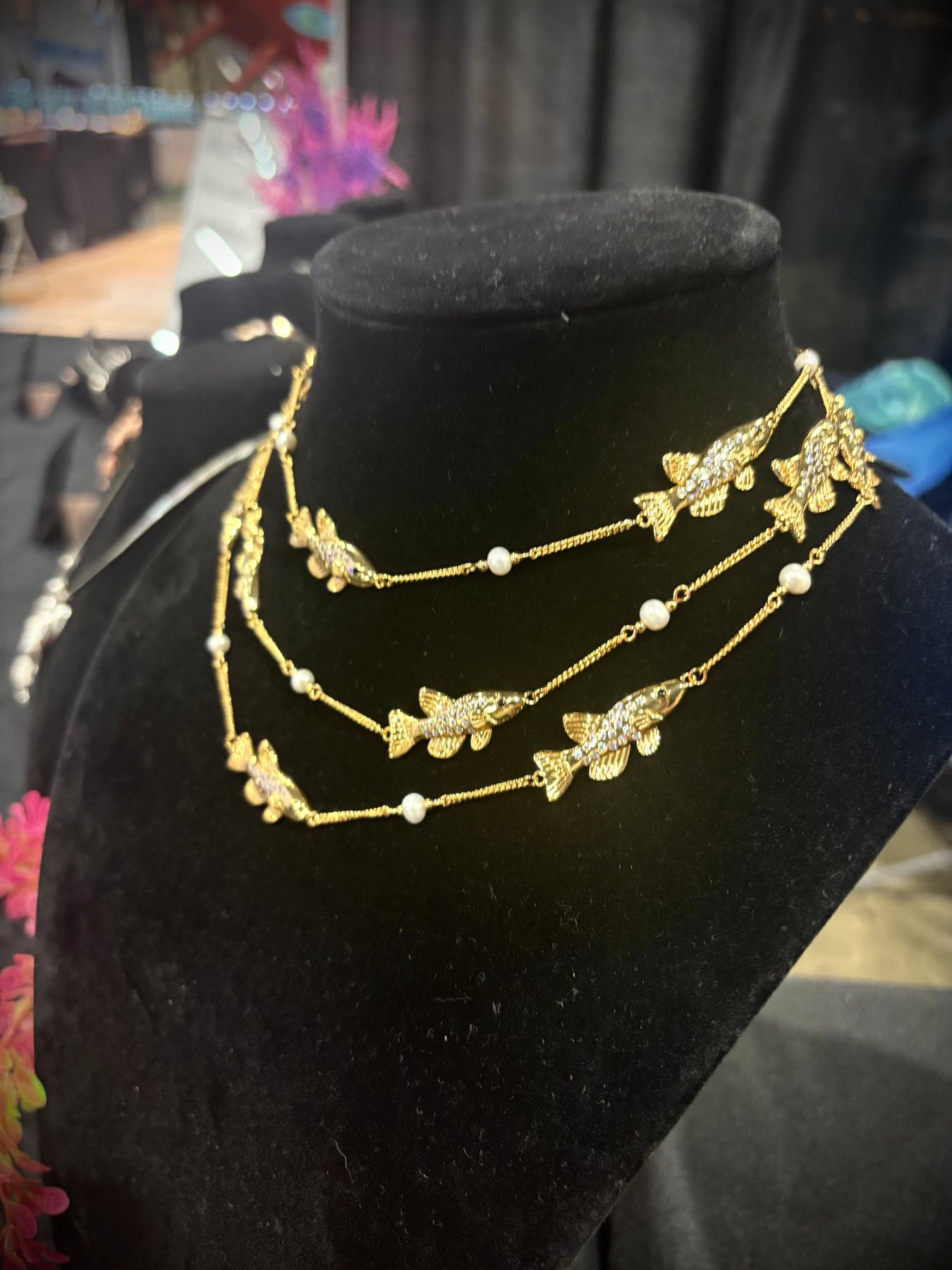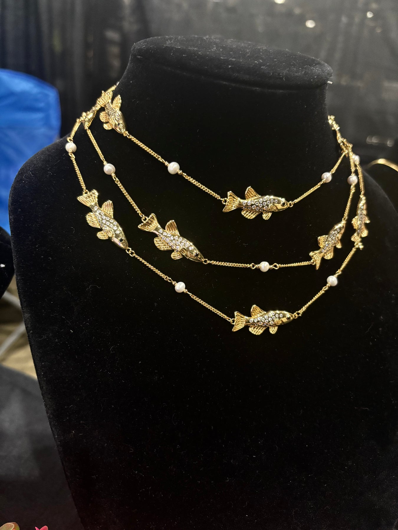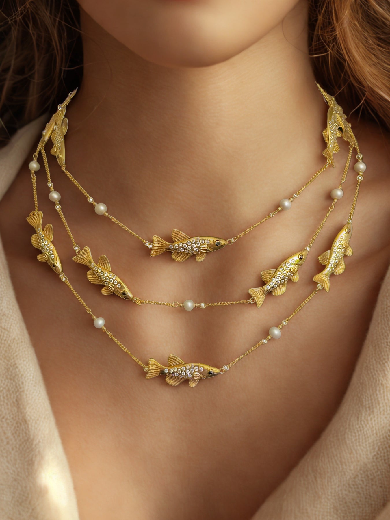 The Celestial Pearl Danio is a small and peaceful freshwater fish characterized by its beautiful jewel-toned body and pearl spots. The beauty of this adorable little fish is captured in the Celestial Pearl Danio Triple Strand with a school of CPDs swimming in 3 chains in one. Each CPD is adorned with AAA cubic zirconia stones for the spots and black obsidian eyes. In between the Danios are natural freshwater pearls to highlight the name of the fish and their infamous pearl spots. The 16” necklace is made with a base metal of 925 sterling silver and plated with 18k gold, making this piece 100% hypoallergenic.